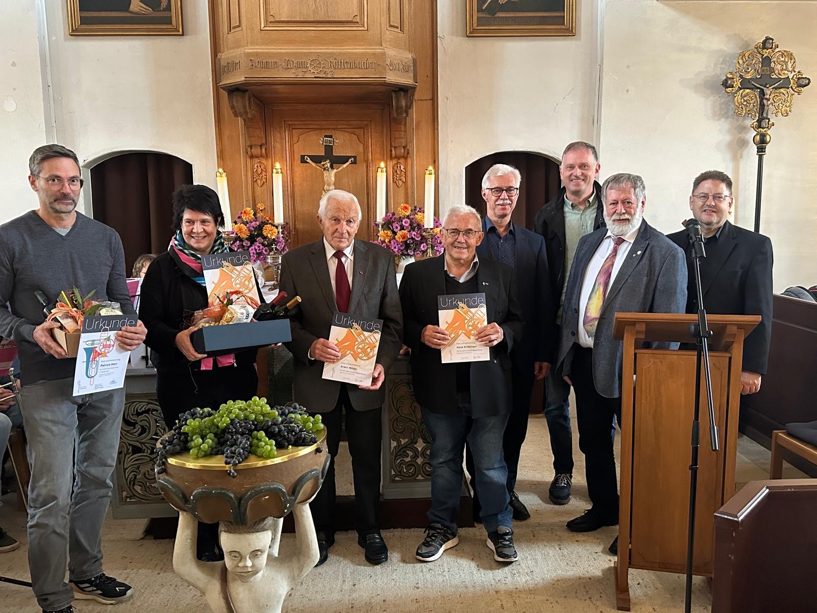 Nachdem in unserer Pfarrei viele Erntedank-Gottesdienste anstehen, fällt der diesjährige Gottesdienst für die Vincenzenbronner Gemeinde bereits auf den 28.09.2025. Bei dieser Gelegenheit danken wir auch unseren langjährigen Bläserinnen und Bläsern, die eine jubiläumswürdige Anzahl an Bläserjahren im Posaunenchor geleistet haben. In diesem Jahr sind es für 10 Jahre treuen Bläserdienst Patrick Herr, der auch gleichzeitig unser Schriftführer ist, Andrea Weber unsere stellvertretende Obfrau für 40 Bläserjahre und für sensationelle 65 Bläserjahre im äußerst aktiven Dienst, für unser erst kürzlich 85 Jahre alt gewordenes und damit ältestes Mitglied Erwin Müller und unseren langjährigen Chorleiter, Landesposaunenwart i. R. und Träger des Verdienstkreuzes am Bande, Hans Knöllinger. Die Ehrungen führten unser Bezirksobmann Hermann Zempel, Bezirkschorleiterkollege Stephan Simon und unser Chorobmann Andreas Kühhorn im Gottesdienst von Pfarrerin Fr. Friedrich durch.